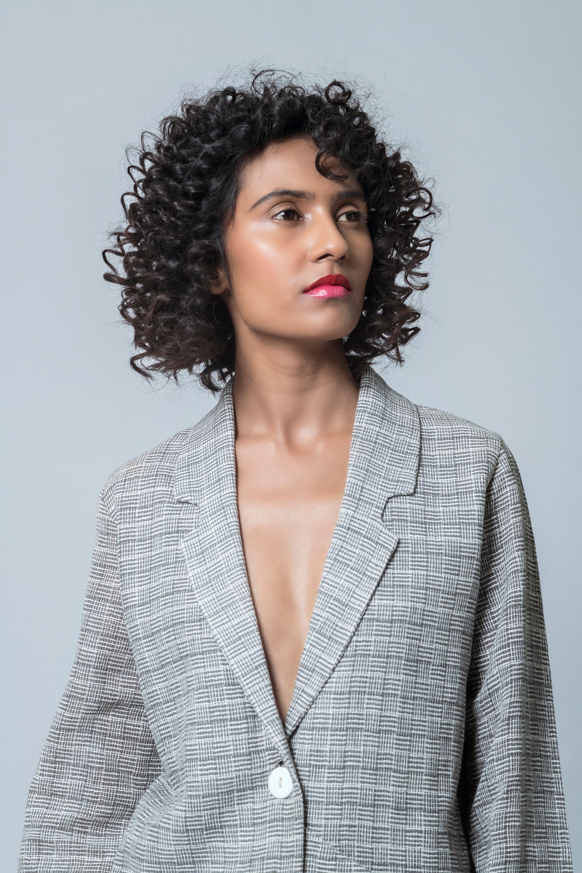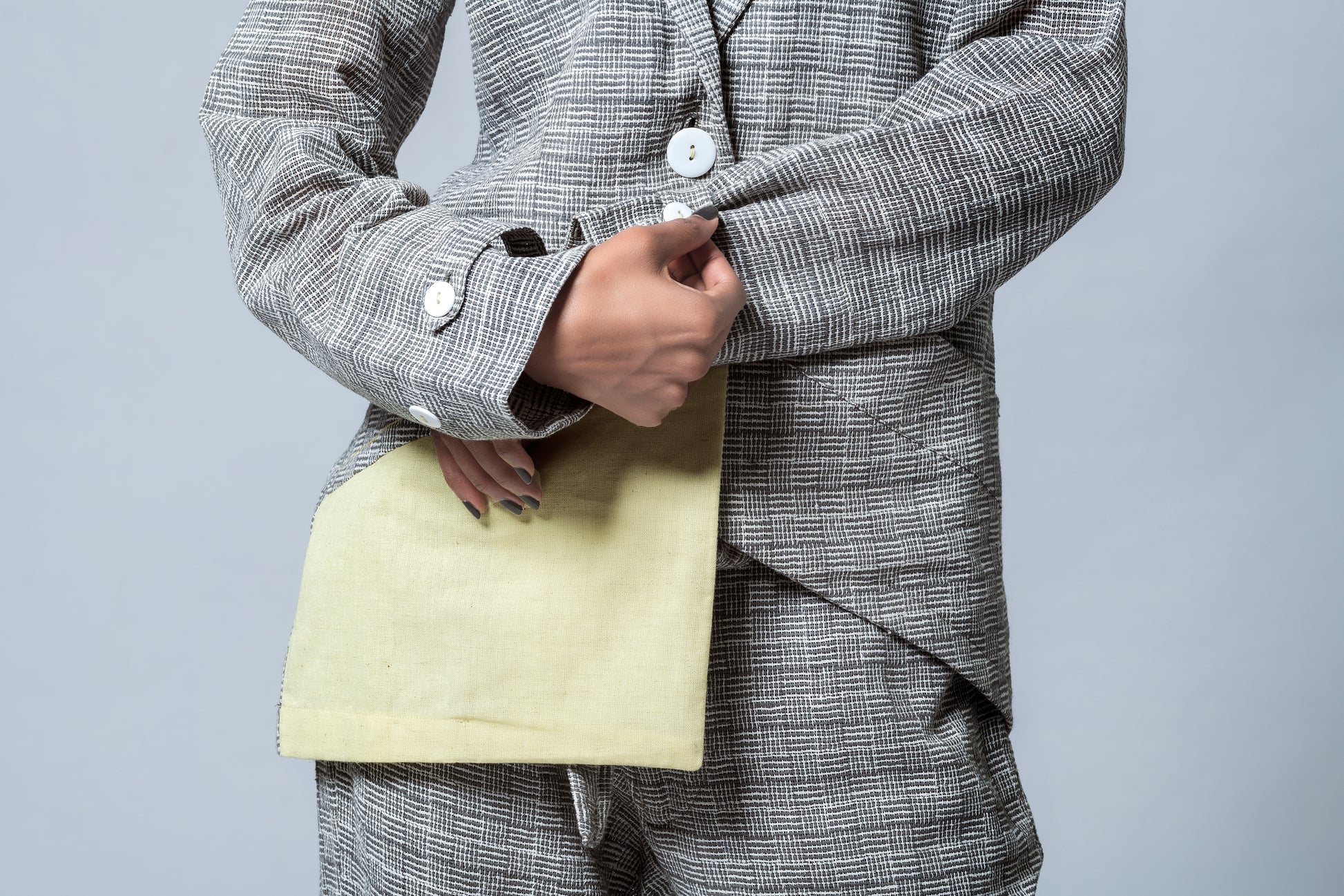 Description: Refined elegance, outerwear with a classic shape and fit with asymmetric hem. Patched with lemon cotton adding summer freshness to 'Period Play'.