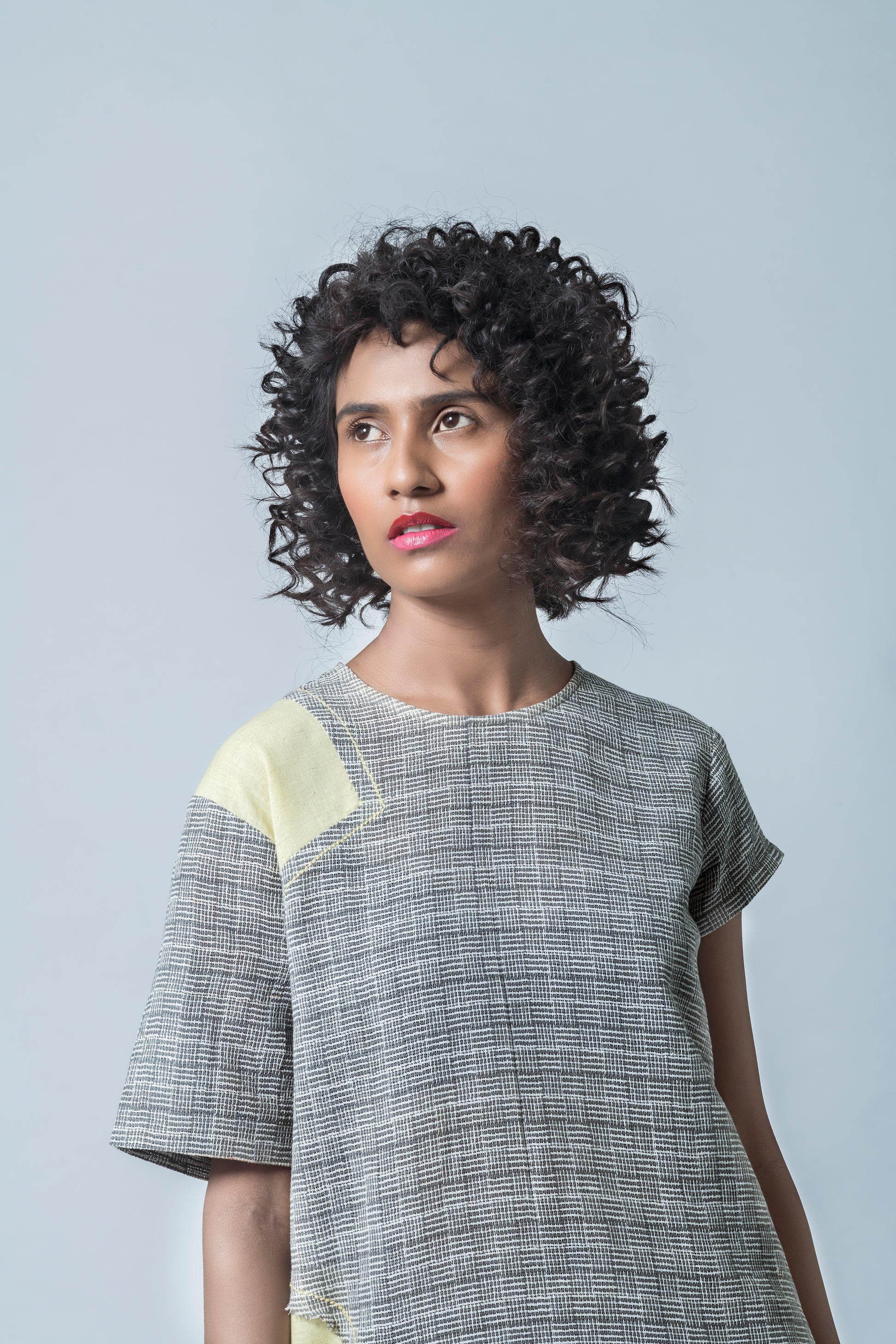 Description: Pattern play for 'Period Play'. Make a statement in this dress with contemporary weaves and asymmetric sleeves, with the full stop form of punctuation in lemon yellow with raw edges and topstitch details.