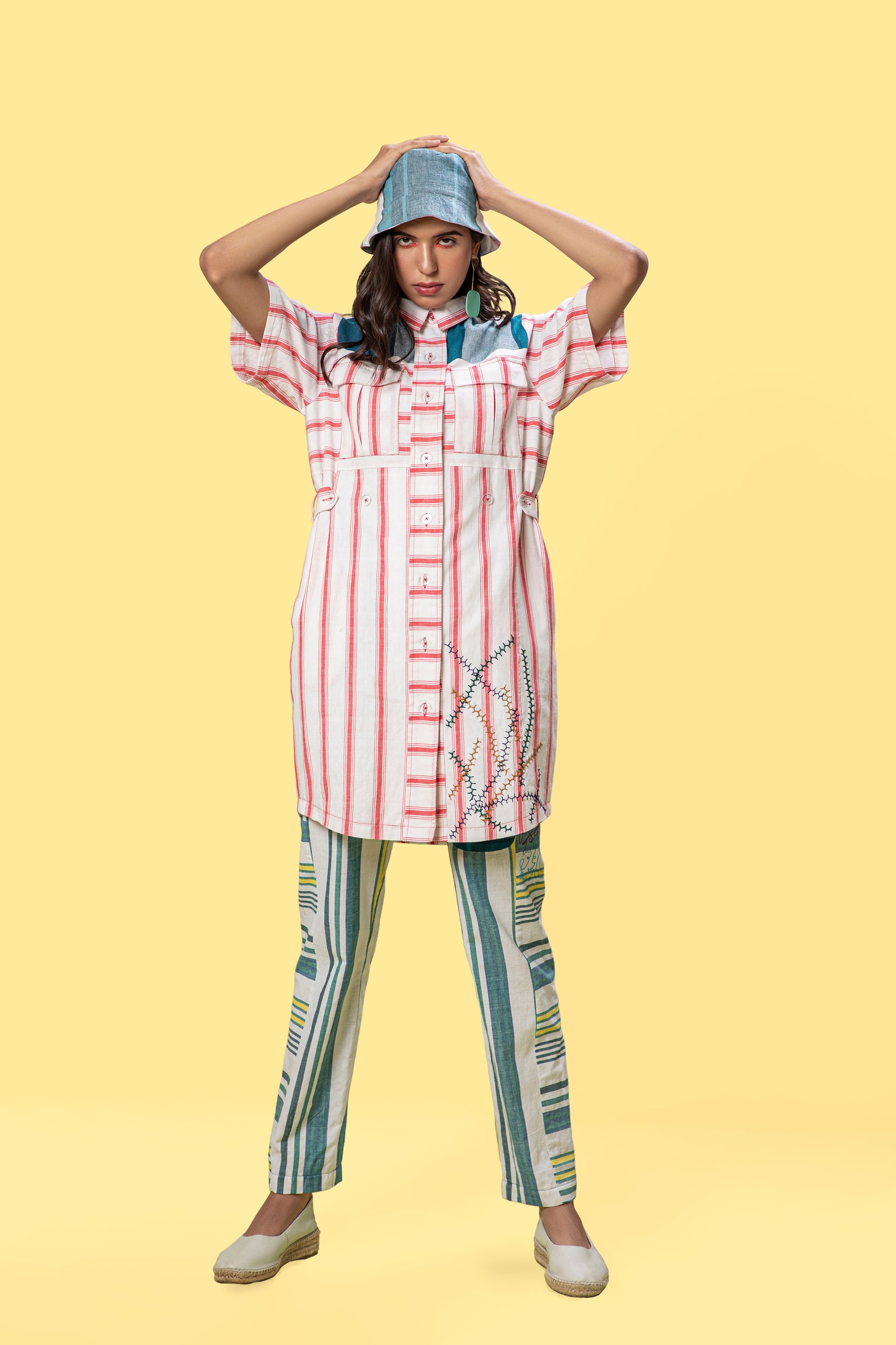 Description: This relaxed fit striped shirt dress has a crisp collar and a double yoke with flap pockets. It features blanket stitch embroidery on the bottom expressing hate. It has a detachable belt that cinches the waist with buttons, making it perfect for both, work and play.