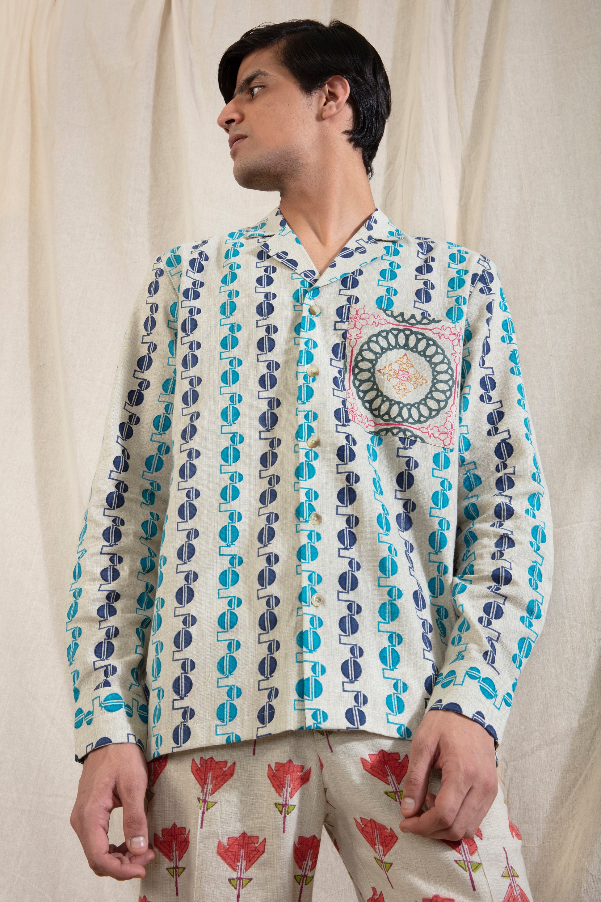 Description: Camp collar shirt in a blue geometric print. The contrast tile print pocket is the highlight of this shirt. Pairs well with casual trousers or relaxed tailoring.
