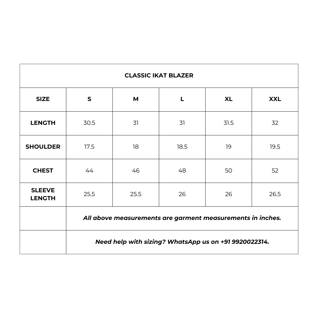 - Description: The Classic Ikat Blazer brings timeless sophistication with a touch of heritage. Crafted in bold Pochampally Ikat, it combines tailored structure with cultural charm, making it the perfect statement piece for both modern and classic looks.