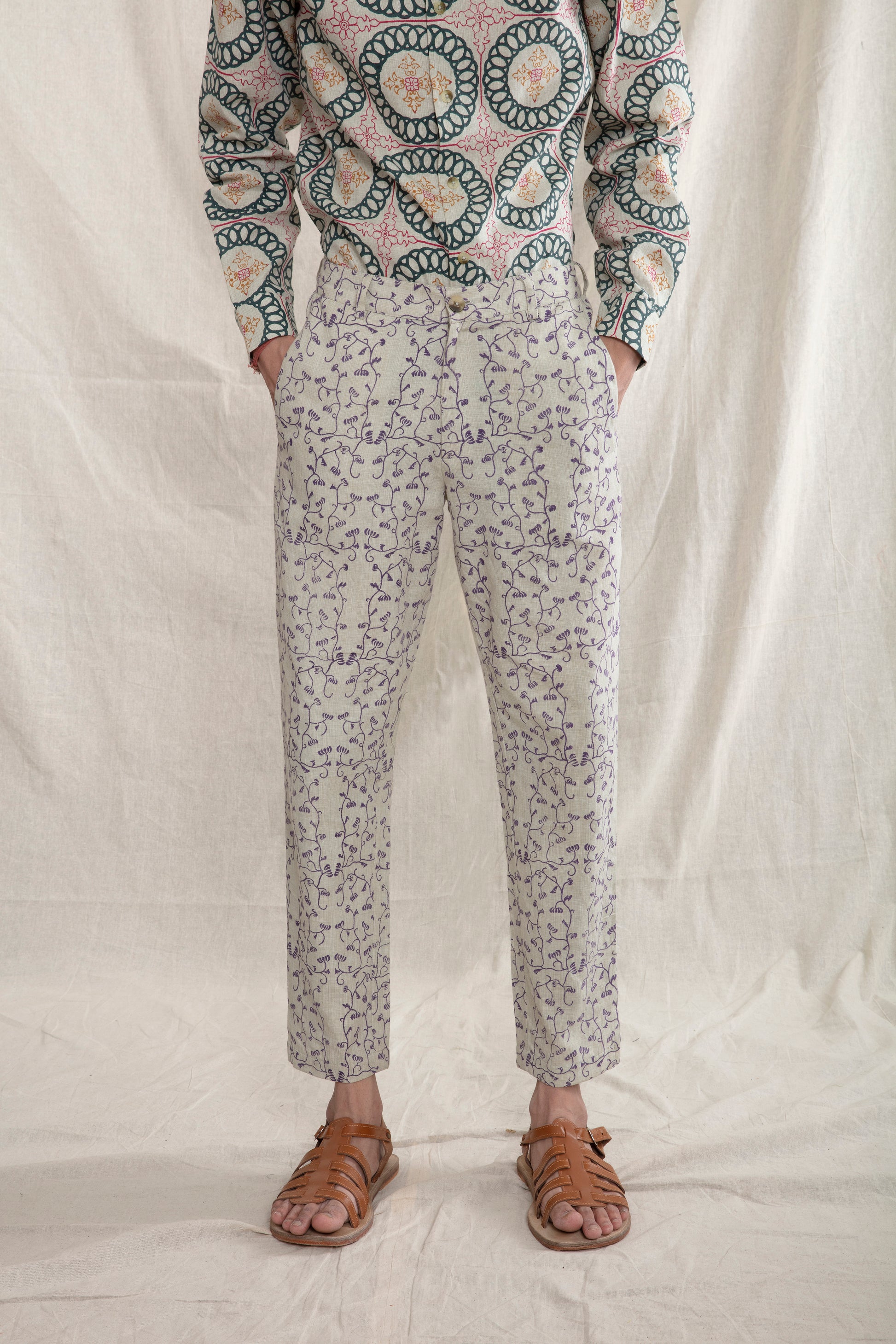 Description: Relaxed fit cropped pants featuring our intricate floral print. The asymmetric hems of these pants are a noteworthy detail. Side pockets.