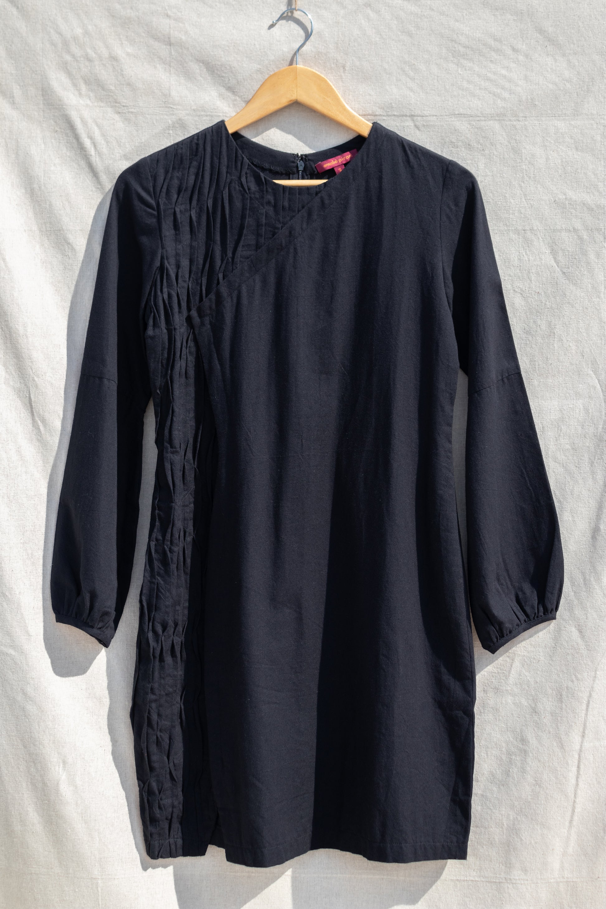 Description: A panel of knife pleats with random tacks creating a wave-like texture, fitted at the waist and full sleeves, this dress is your go-to for every kind of evening.