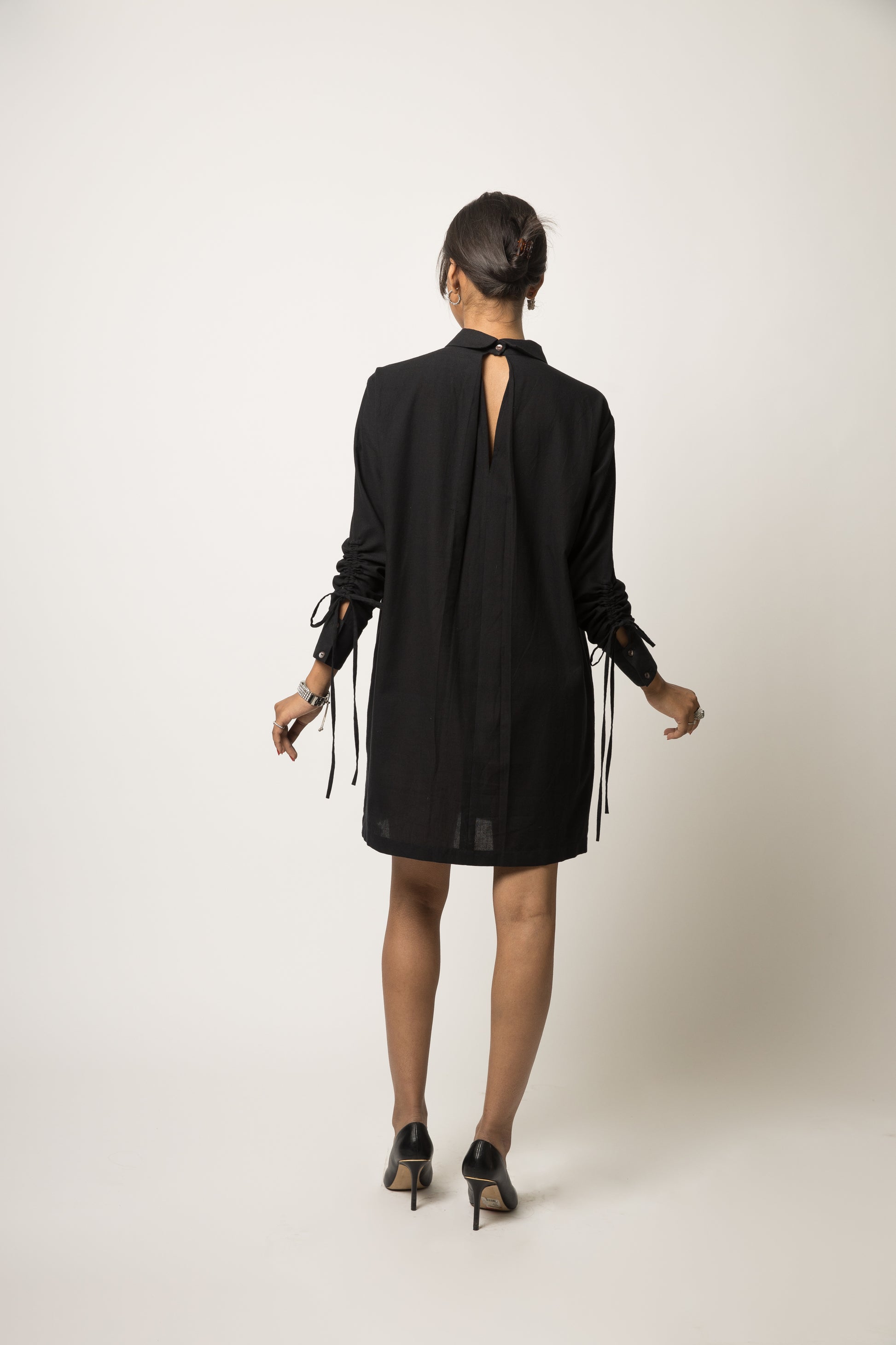 Description: This mini shirt dress is designed with ruched sleeves and a jewelled collar. The collar is buttoned at the back and has keyhole with knife pleats that add volume to the A-line shape.
