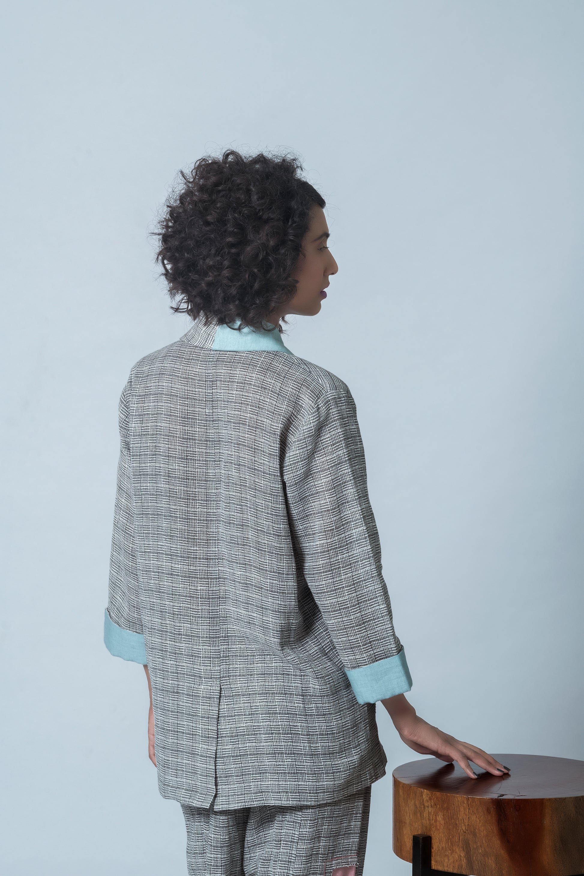 Description: A tailored piece where clean lines combine with ease. Made from jute cotton, this Oversized Jacket has an asymmetric lapel with aqua handwoven cotton block on one side. The perfect pop!