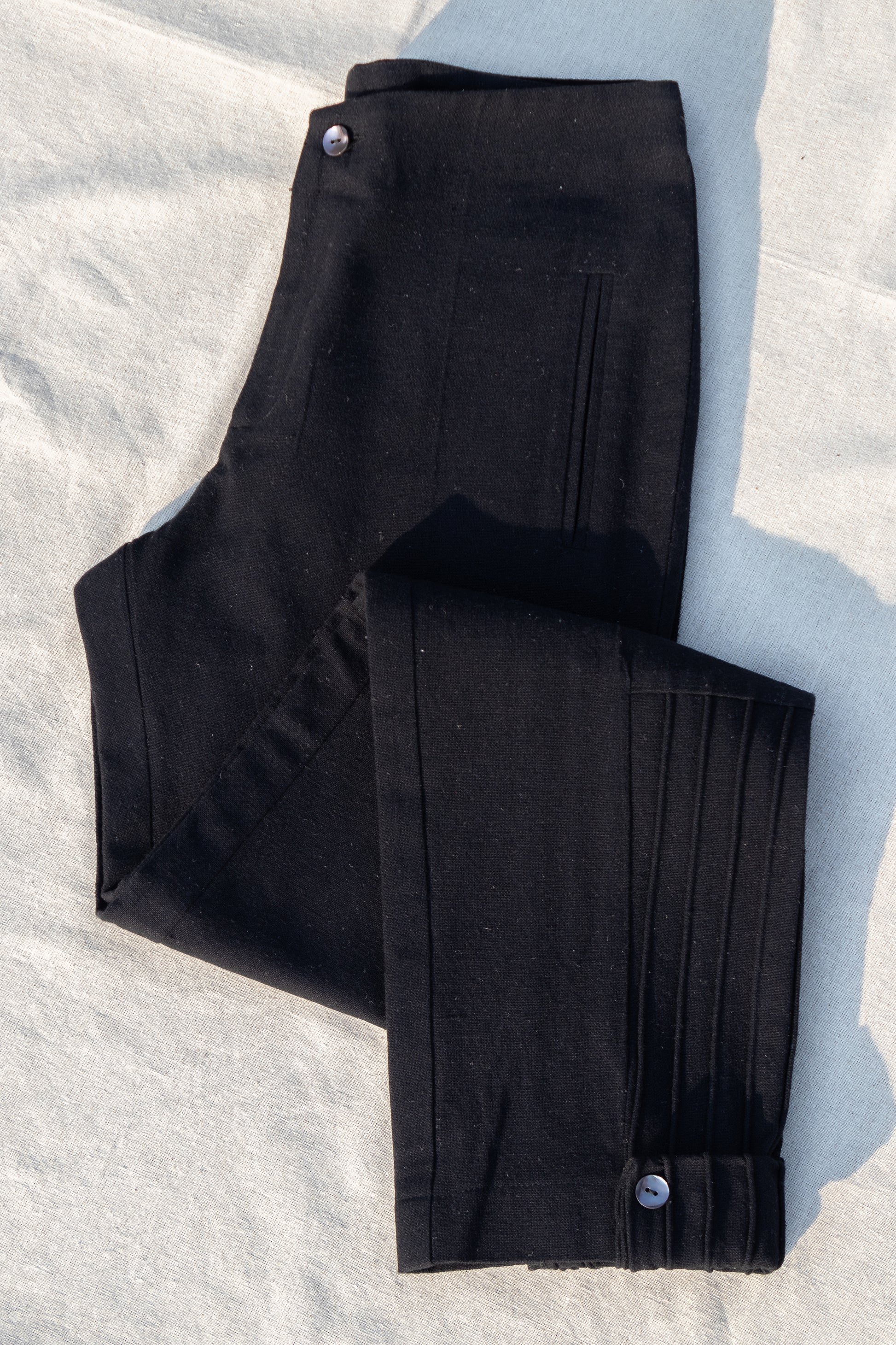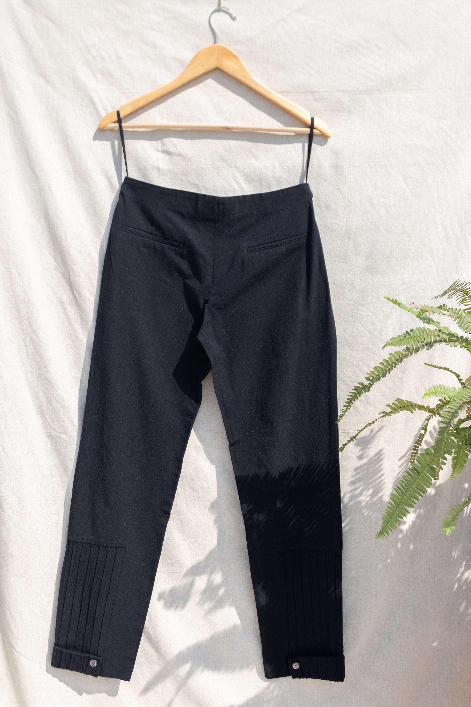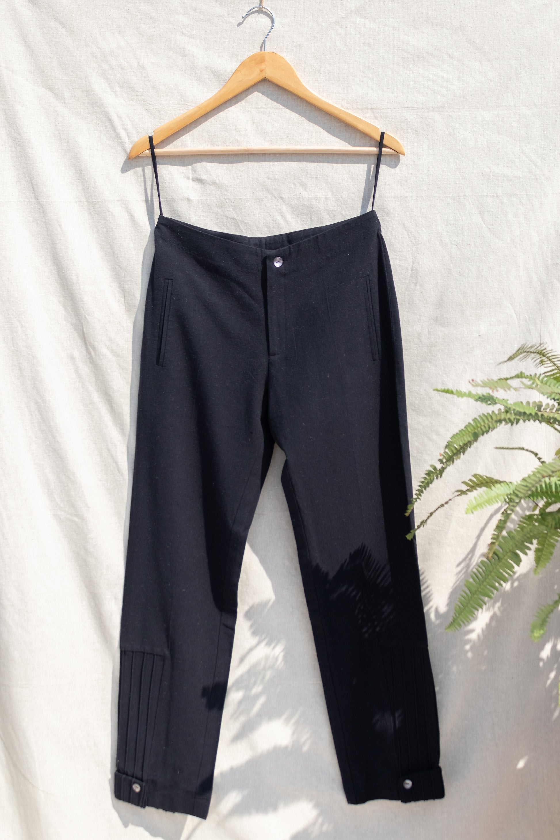 Description: Pants with no waistband and corded bottom patch, designed to feel classy and effortless.