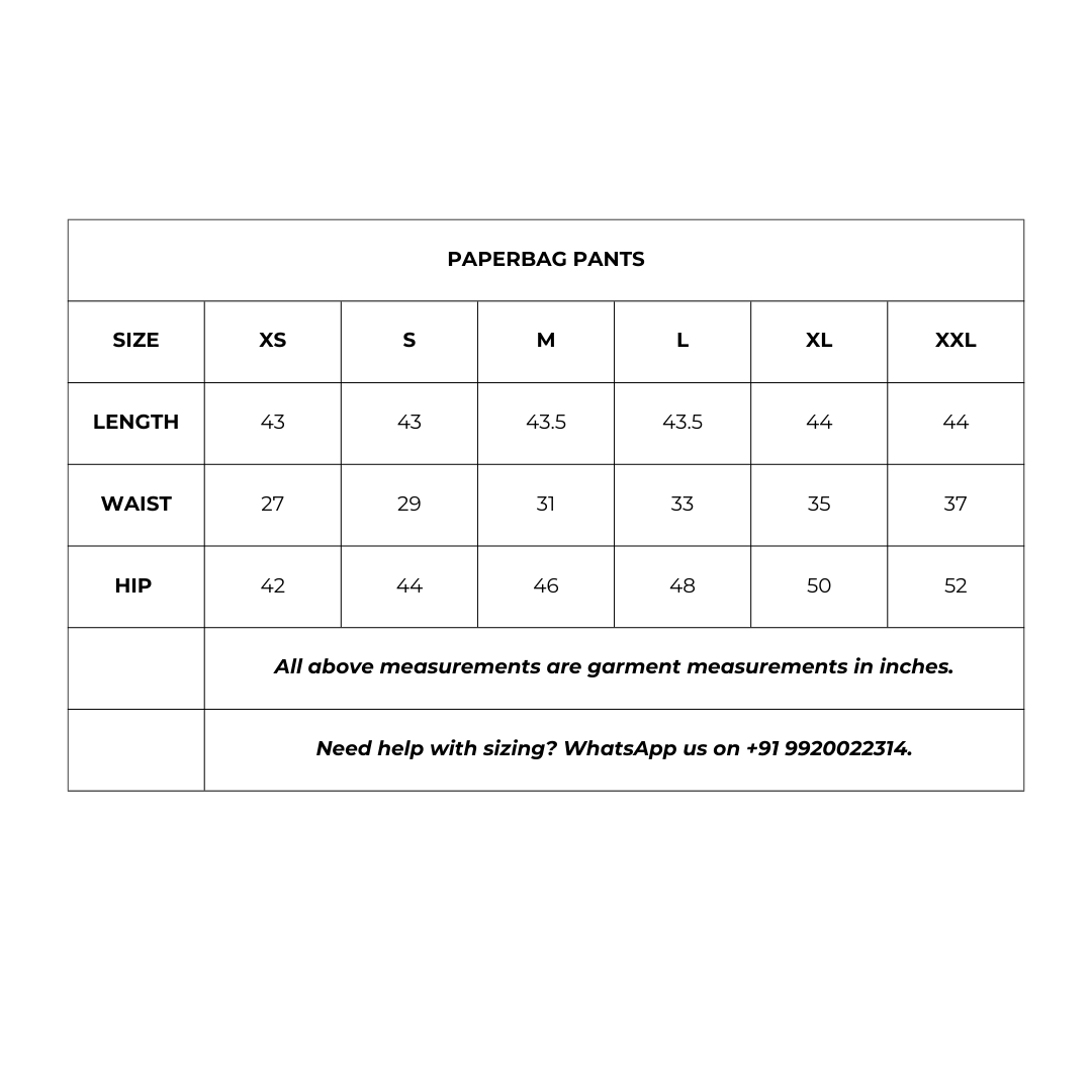- Description: The Paperbag Pants combine comfort with chic style. Featuring a high, cinched waist and a relaxed fit, they offer a flattering silhouette that’s effortlessly elegant—perfect for dressing up or down.