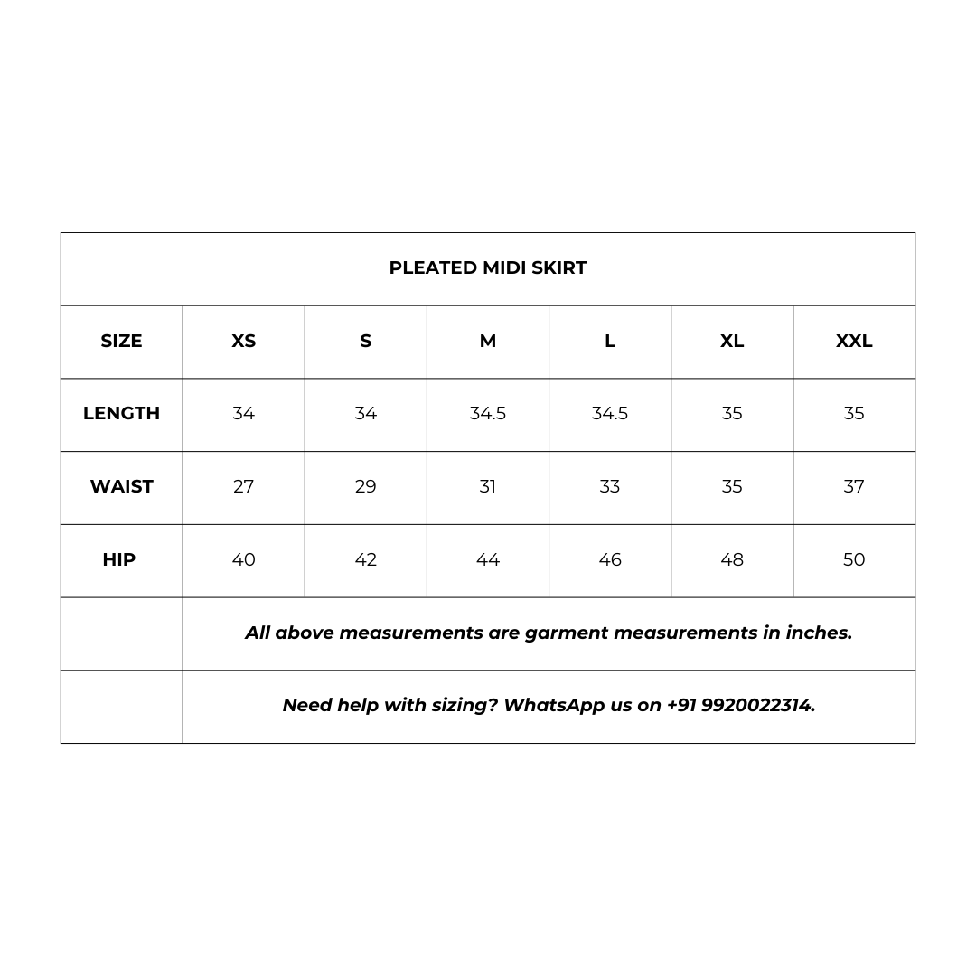- Description: The Pleated Midi Skirt combines timeless elegance with everyday versatility. Featuring sharp pleats and a graceful length, it moves beautifully with every step—perfect for dressing up or down.