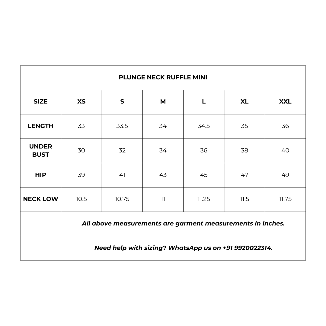 - Description: The Plunge Neck Ruffle Mini brings flirty charm with a daring edge. Featuring a deep V-neckline and playful ruffles at the hem, it’s perfect for nights out or special moments when you want to turn heads.