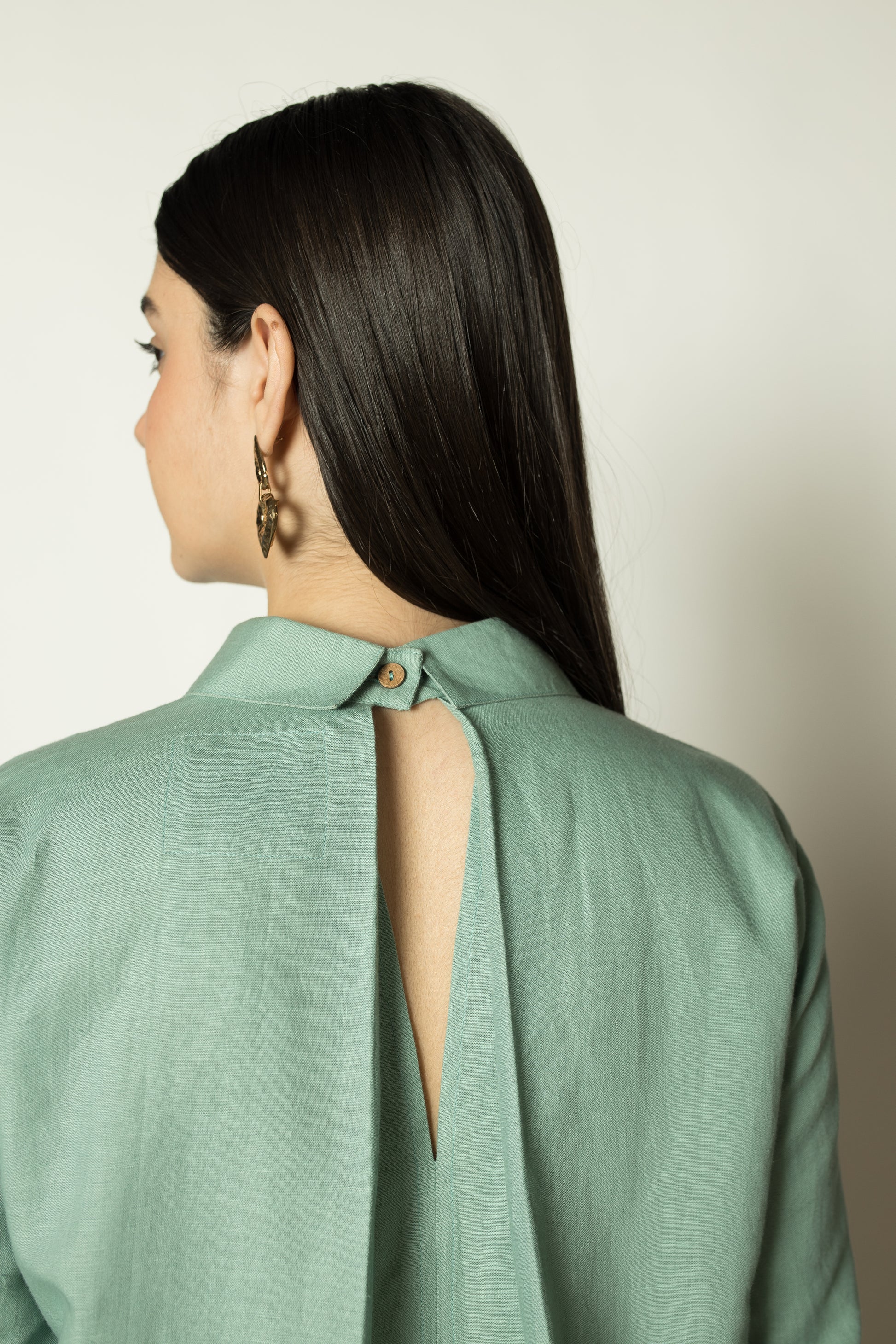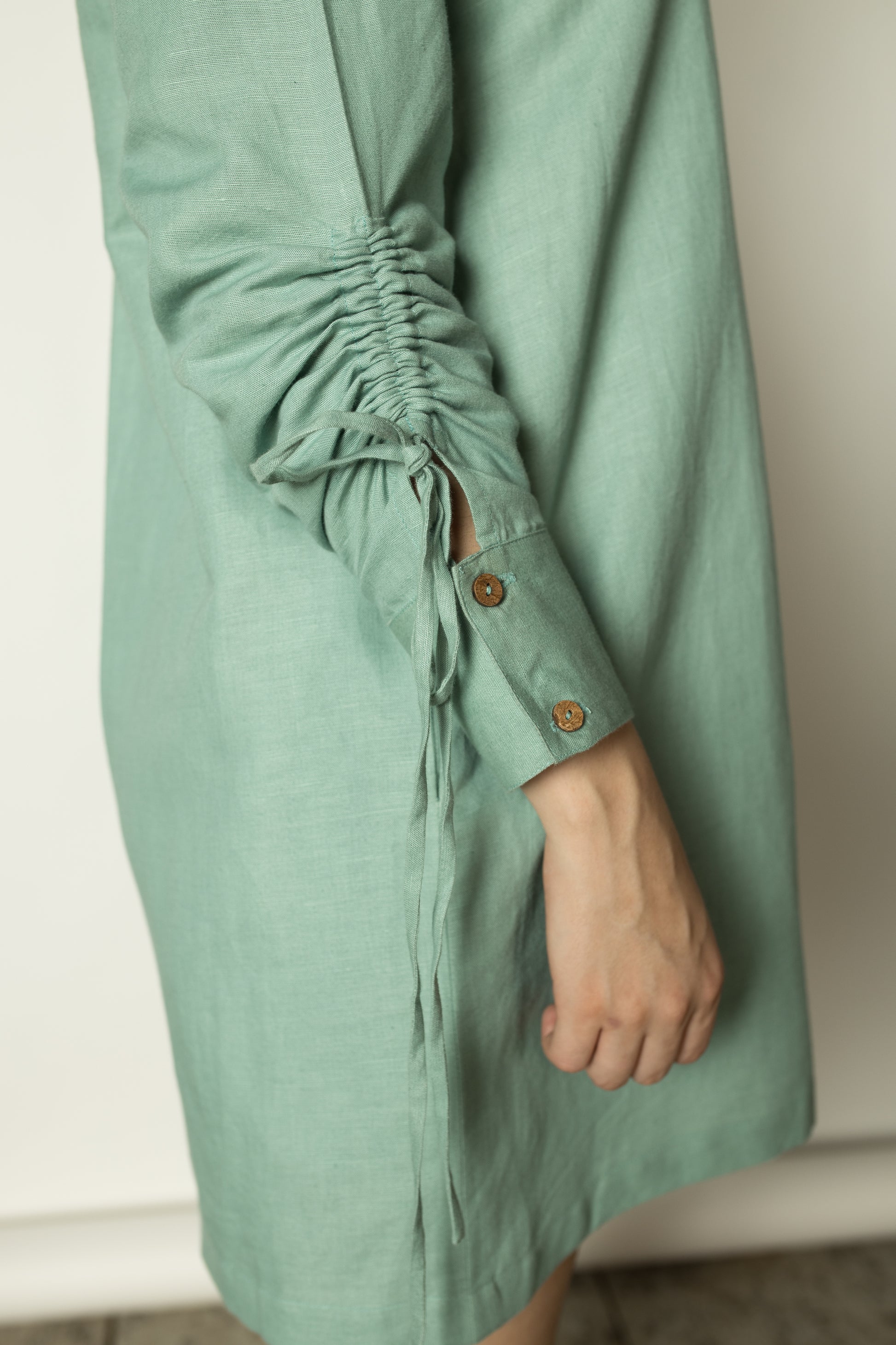 Description: This mini shirt dress is designed with ruched sleeves that is a subtle nod to this season’s romance trend. It features a regular collar in the front with a button at the back and a keyhole with knife pleats that adds volume to the A-line shape.