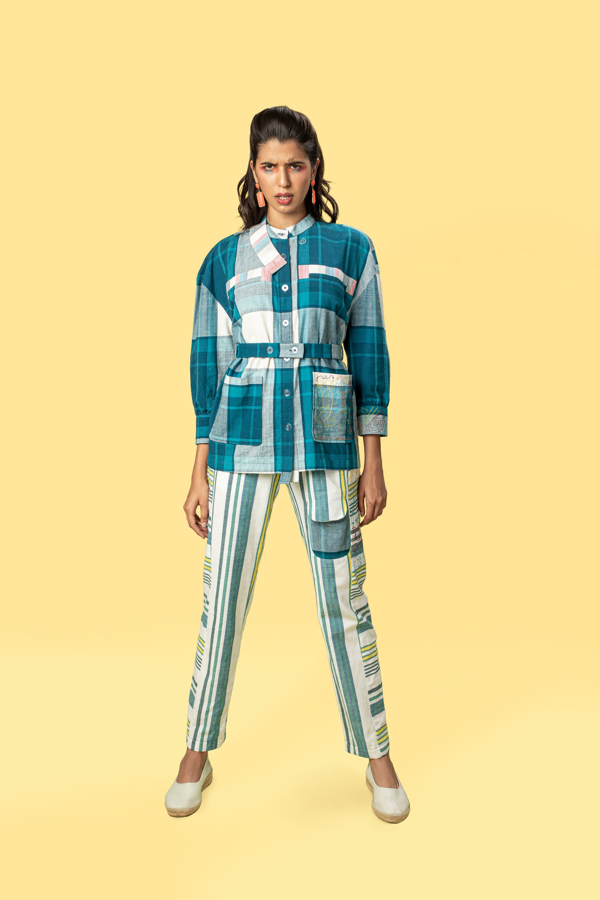 Description: This one is our take on a classic Safari Pant. This pant features no waistband, wide belt loops, a front flap pocket and horizontal striped panels with random machine embroidery. Pair it with our Safari Shirt for a confused look.