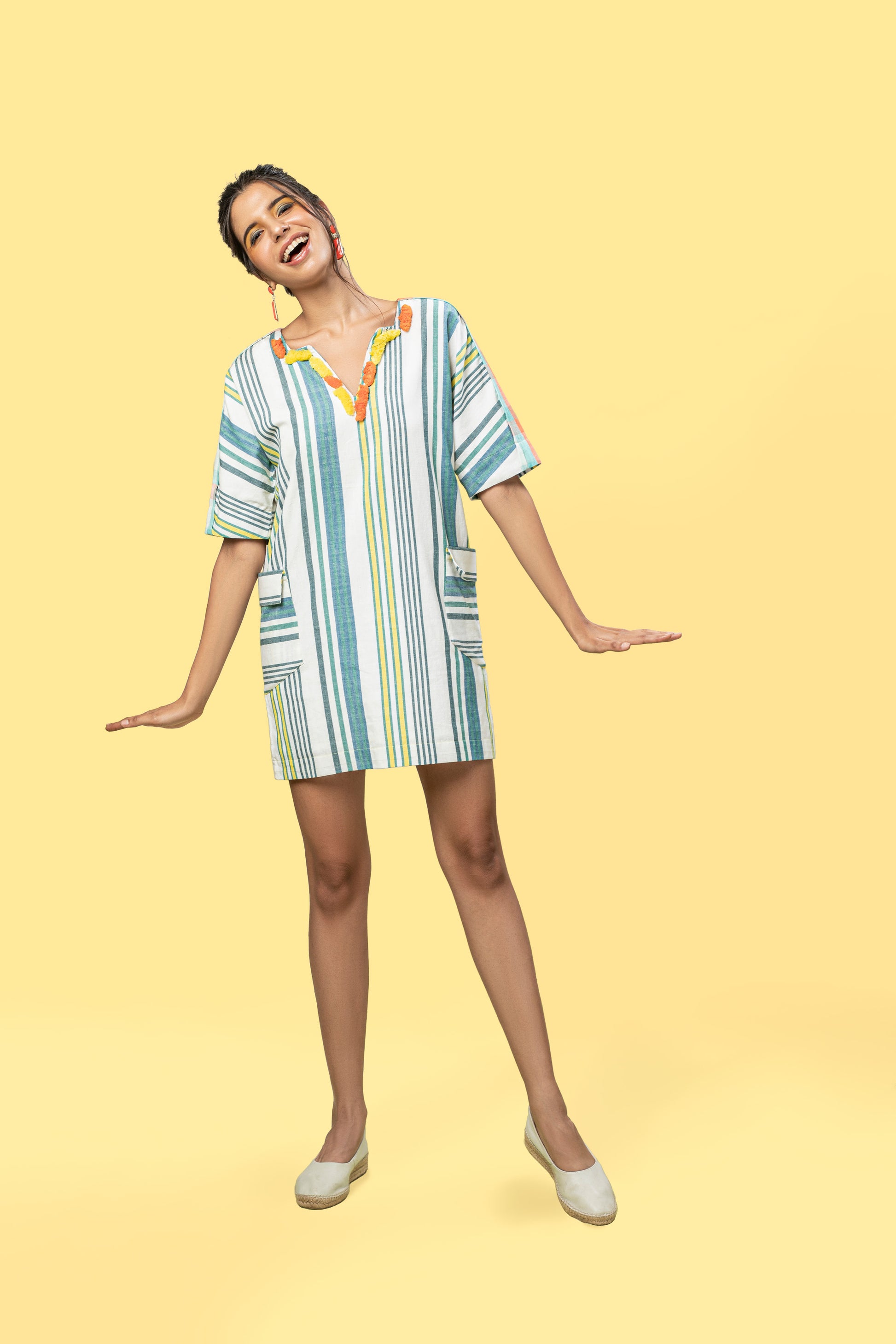 Description: In lightweight cotton, this dress has a pretty neckline with handmade fringes for your humorous soul. With oversized patch pockets on the side, this versatile dress has a flattering silhouette.