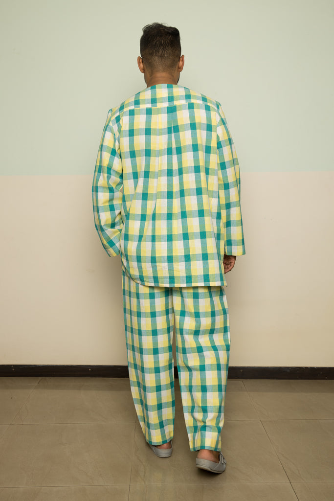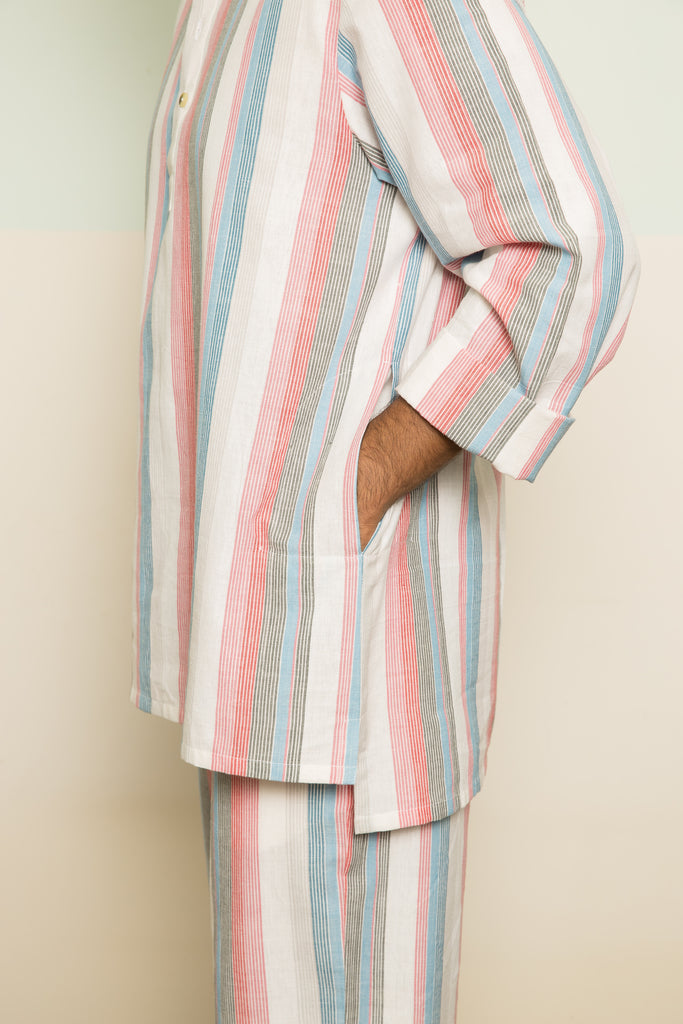 Description: An absolute comfort and versatile set. This set is ideal for just any indoor or outdoor event. It can be dressed up or down. Crafted in breathable handwoven cotton in Chennai checks and stripes.
