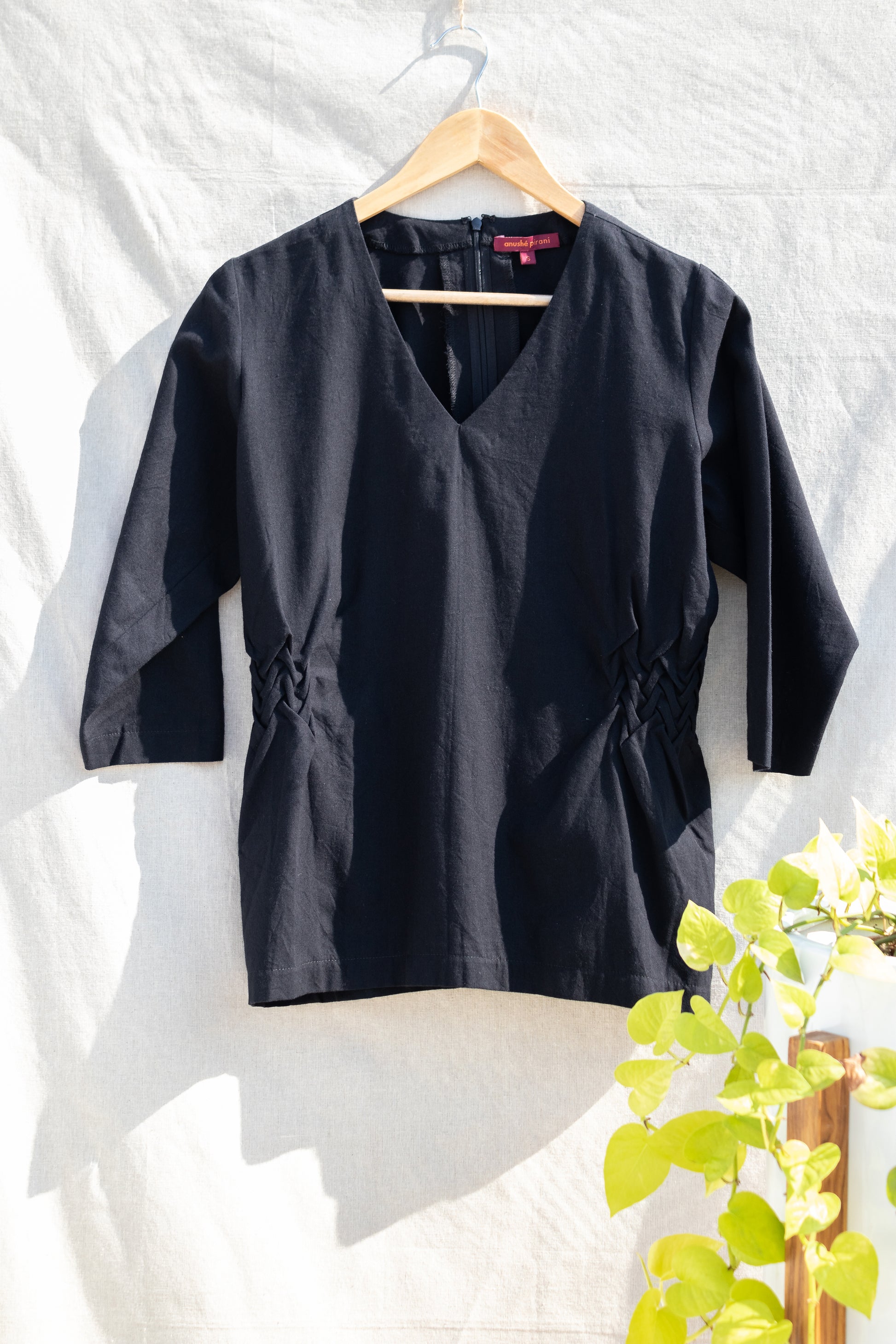 Description: Lattice smocking in this modern cut V neck top offers a unique and personal aesthetic charm of handwork.
