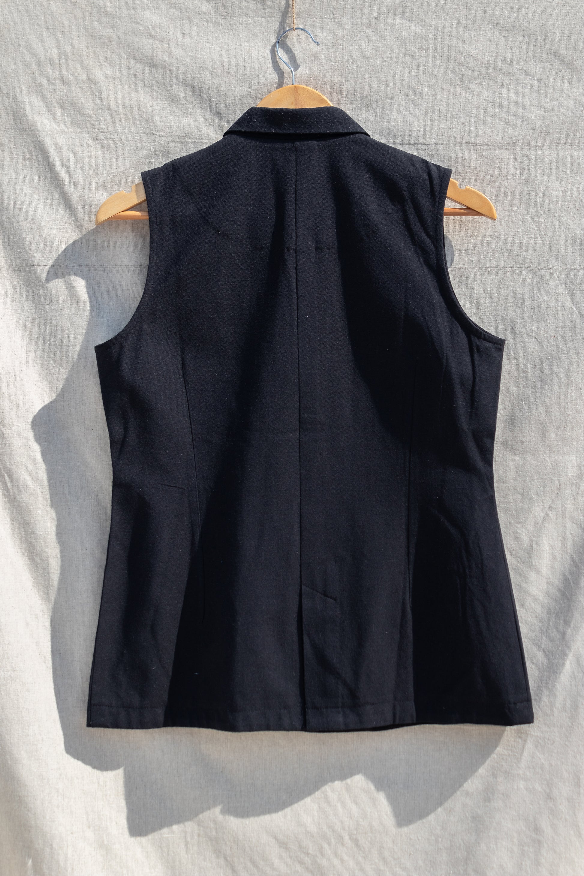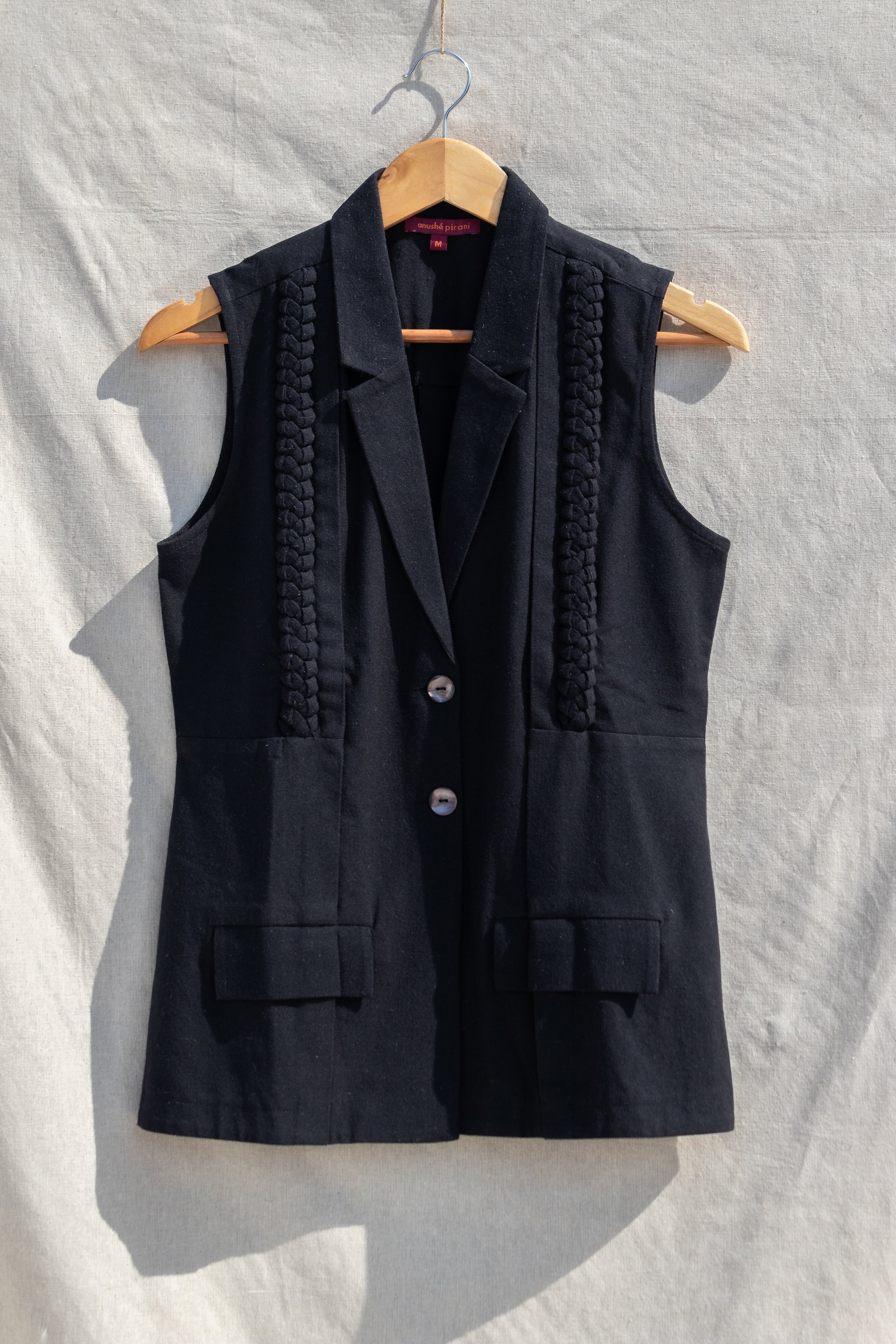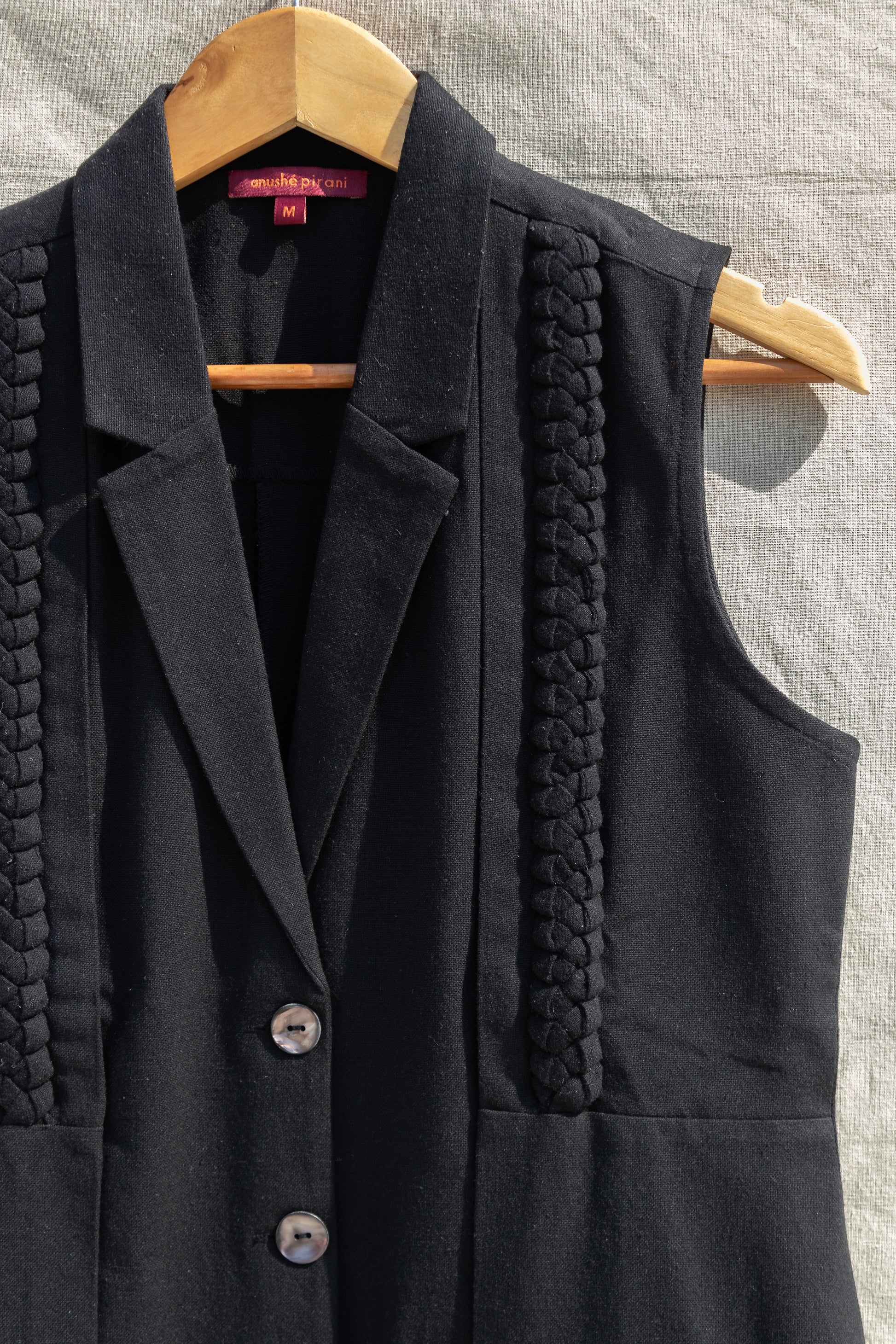 Description: A modern take on classic black luxurious separates. This Vest with Braids offers layering for evening and power dressing.